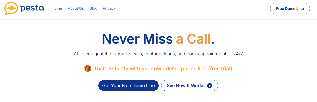 A Pesta é uma plataforma de agentes de voz com inteligência artificial que atendem chamadas, capturam leads e agendam compromissos automaticamente, otimizando o atendimento ao cliente e aumentando a eficiência operacional dos negócios.