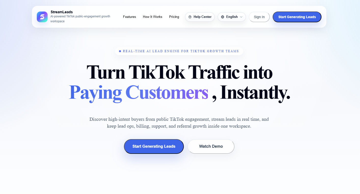 Descrição da ferramenta: StreamLeads é uma plataforma de automação que utiliza inteligência artificial para identificar e engajar compradores potenciais no TikTok, facilitando a geração de leads qualificados de forma eficiente e automatizada.