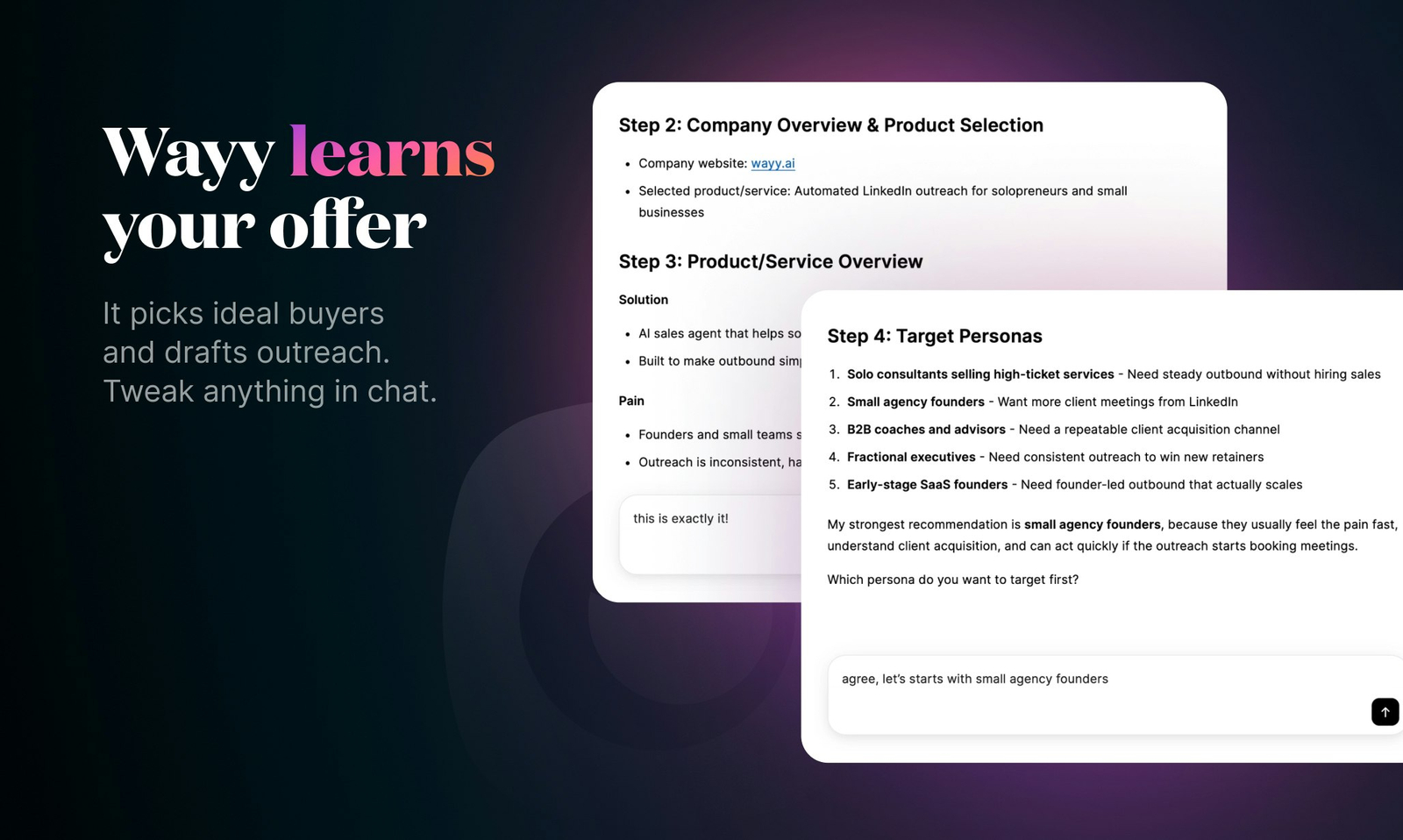 Descrição da ferramenta: Wayy.ai é uma ferramenta de inteligência artificial que automatiza o outreach no LinkedIn, identificando prospects, enviando convites e realizando follow-ups, facilitando a geração de leads para empreendedores individuais.