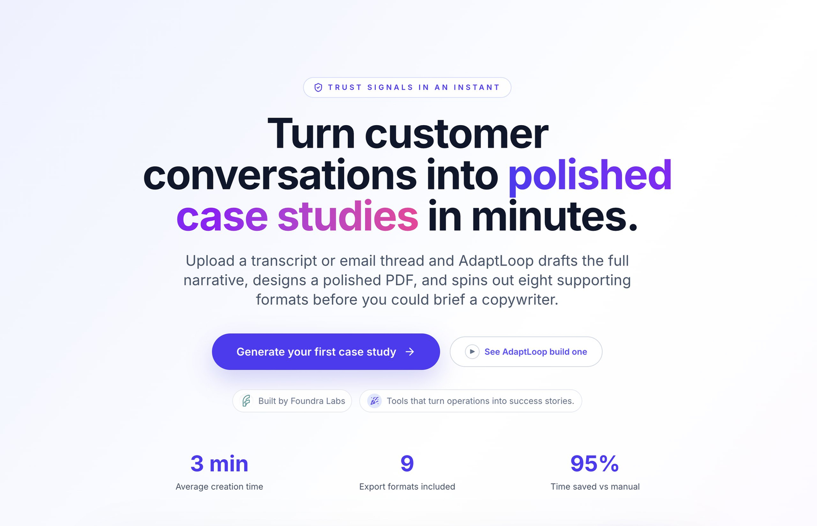 Descrição da ferramenta: AdaptLoop converte conversas com clientes em estudos de caso completos, incluindo narrativa, métricas e citações, em minutos. Basta inserir transcrições ou resumos para gerar documentos exportáveis como PDF e slides, acelerando o fechamento de negócios.