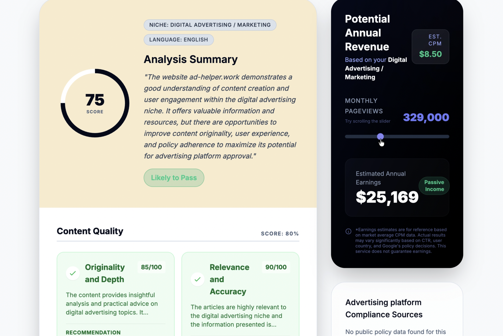 📊 Análise Detalhada: Avalia a elegibilidade do site para plataformas publicitárias e fornece estimativas de receita.