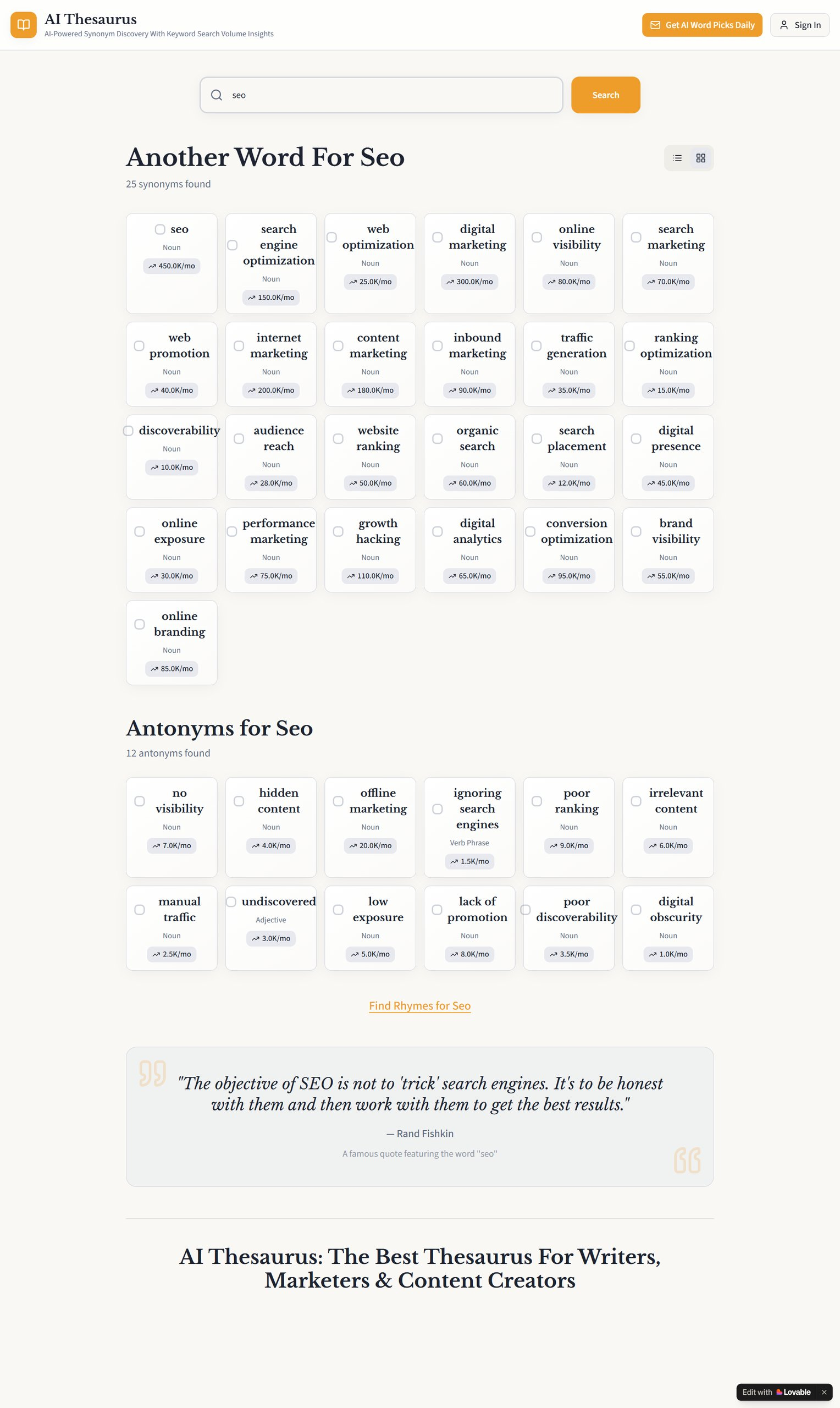 Descrição da ferramenta: AIThesaurus.io é uma ferramenta de SEO que combina volume de busca em tempo real com sinônimos, auxiliando na identificação de nichos menos competitivos e oportunidades de crescimento de conteúdo na era da inteligência artificial.