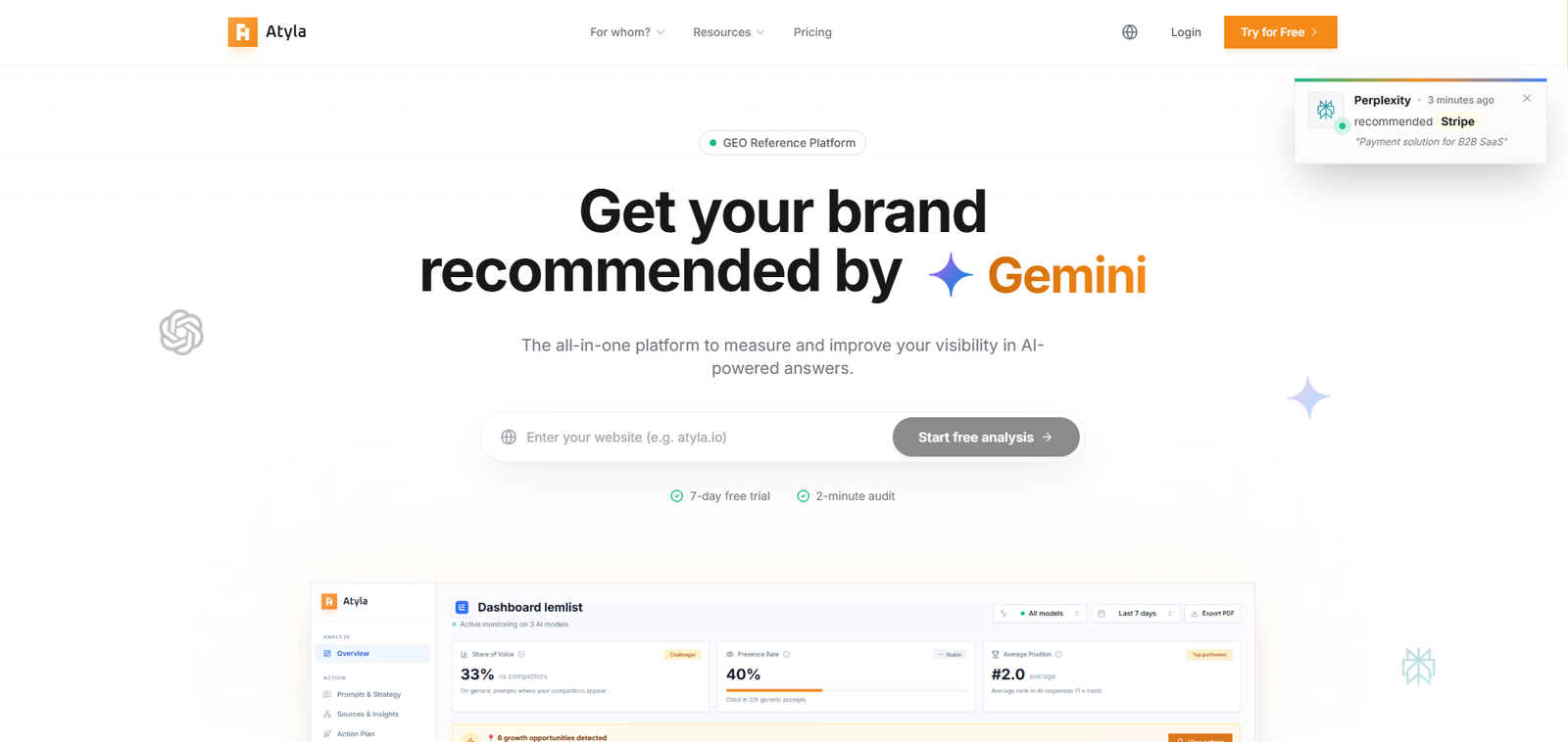 Descrição da ferramenta: Atyla é uma plataforma de SEO voltada para motores de busca com IA, permitindo que equipes de marketing monitorem e aprimorem a visibilidade da marca em buscas realizadas por ChatGPT, Gemini, Perplexity e Claude, transformando a presença em um canal de crescimento mensurável.