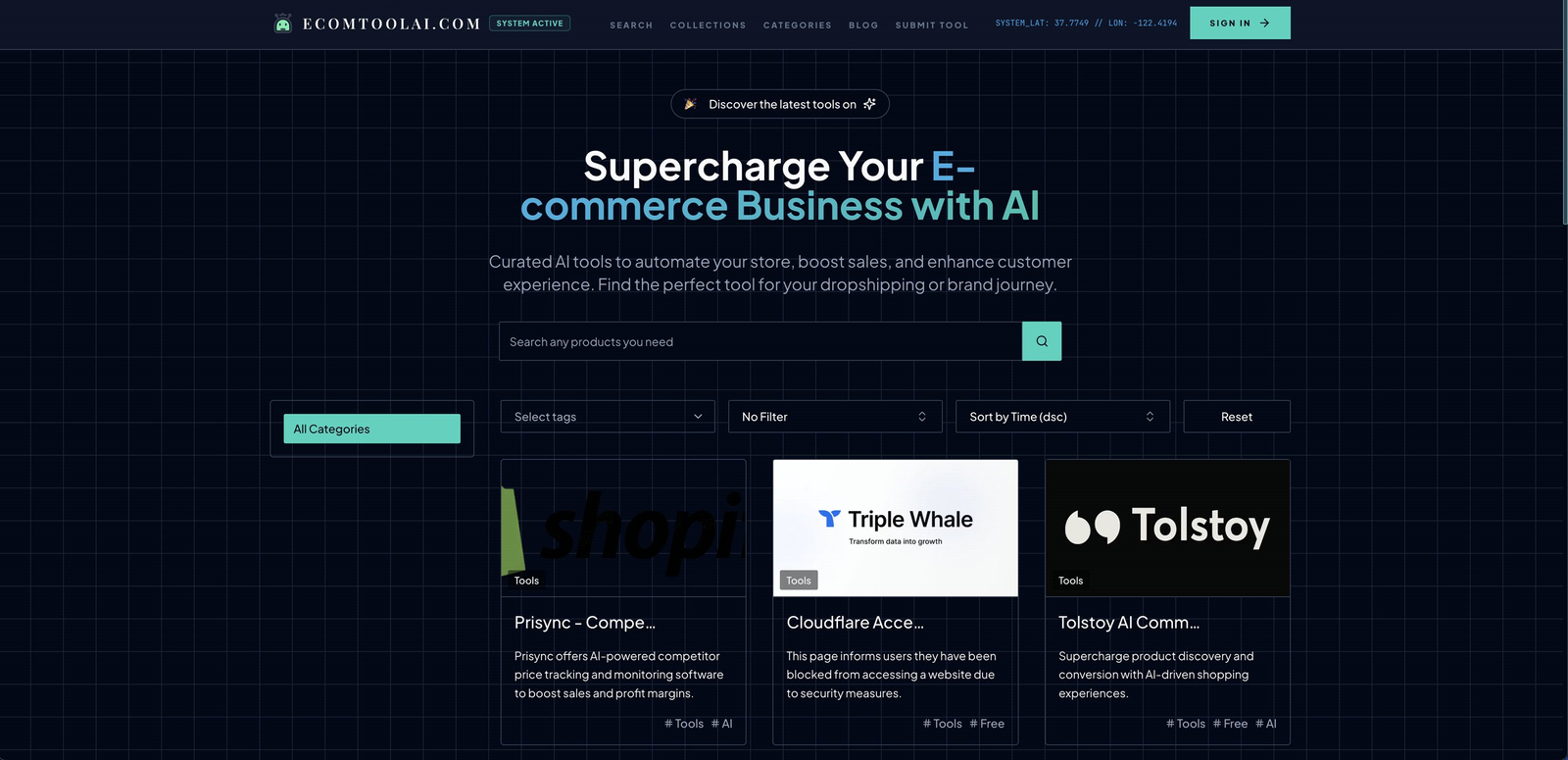 Descrição da ferramenta: ecomtoolai.com é um diretório especializado que reúne ferramentas de inteligência artificial voltadas para profissionais de comércio eletrônico, abrangendo áreas como dropshipping, marketing, suporte ao cliente, fotografia de produtos e automação de lojas.