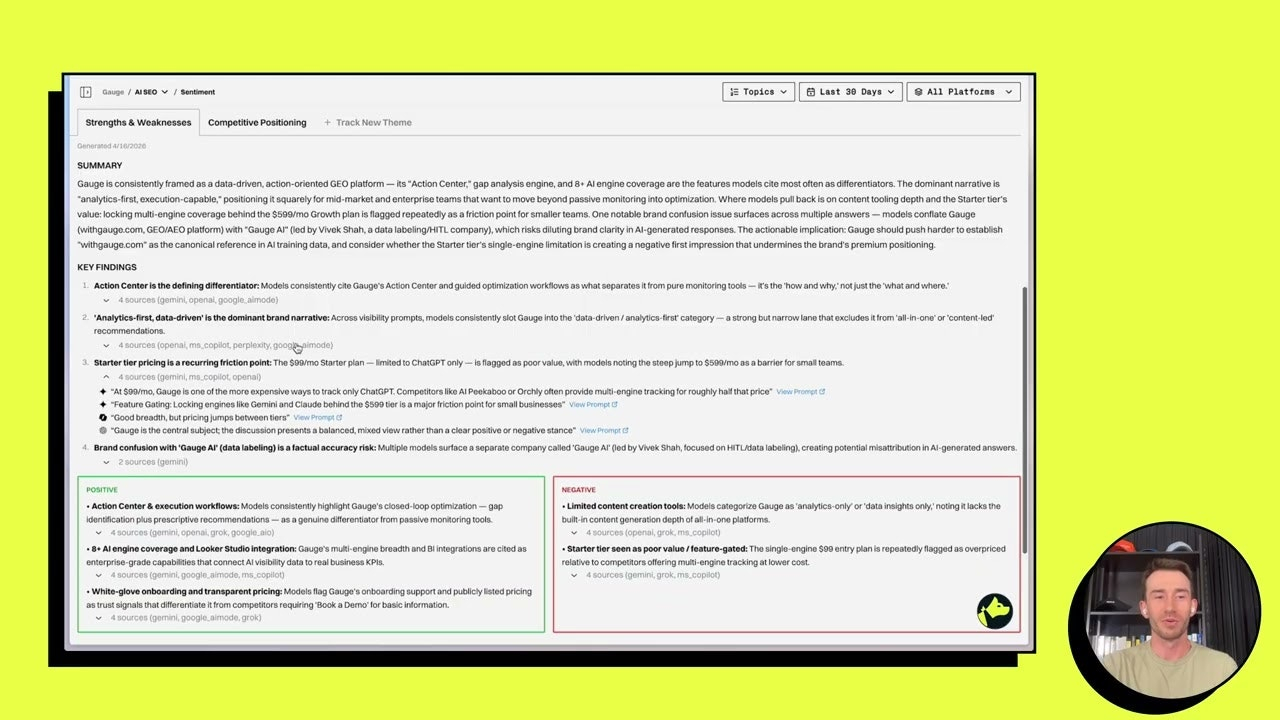 Descrição da ferramenta: Gauge Sentiment analisa como modelos de IA percebem sua marca, identificando menções positivas e negativas, além de rastrear a origem dessas opiniões em diferentes plataformas online.