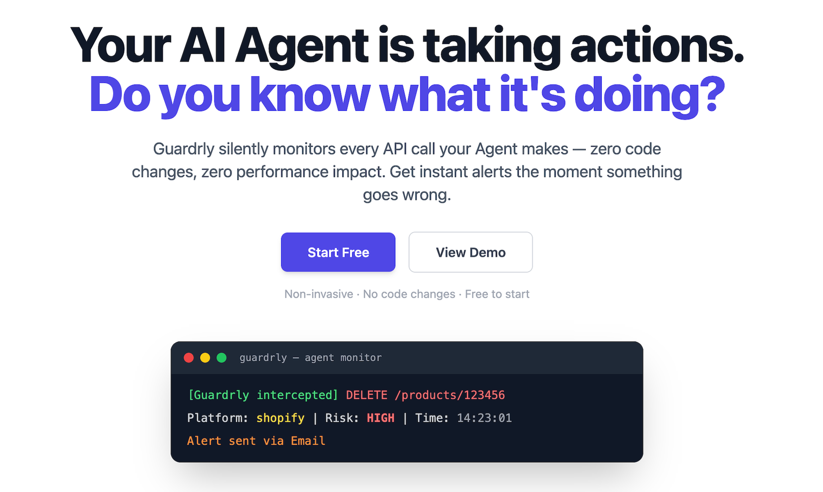 Descrição da ferramenta: Guardrly é uma ferramenta de monitoramento que intercepta e alerta sobre chamadas de API de agentes de IA, protegendo lojas Shopify e contas Meta contra ações de risco, banimentos e perdas financeiras.
