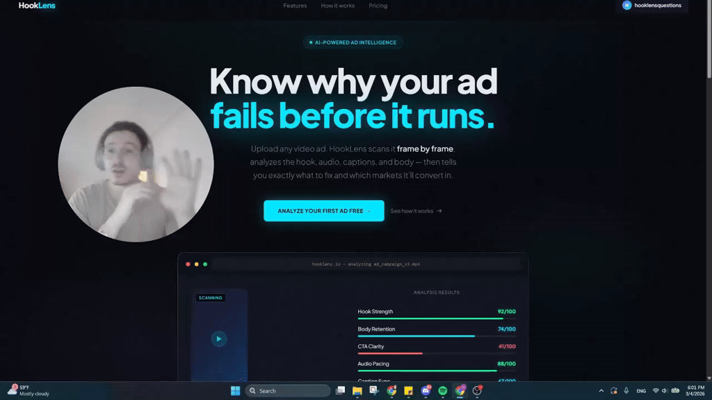 Descrição da ferramenta: HookLens analisa anúncios em vídeo, identificando falhas no gancho, corpo e CTA. Ela fornece relatórios detalhados com pontuações, análise de retenção e sugestões de melhorias, facilitando a otimização de campanhas publicitárias.