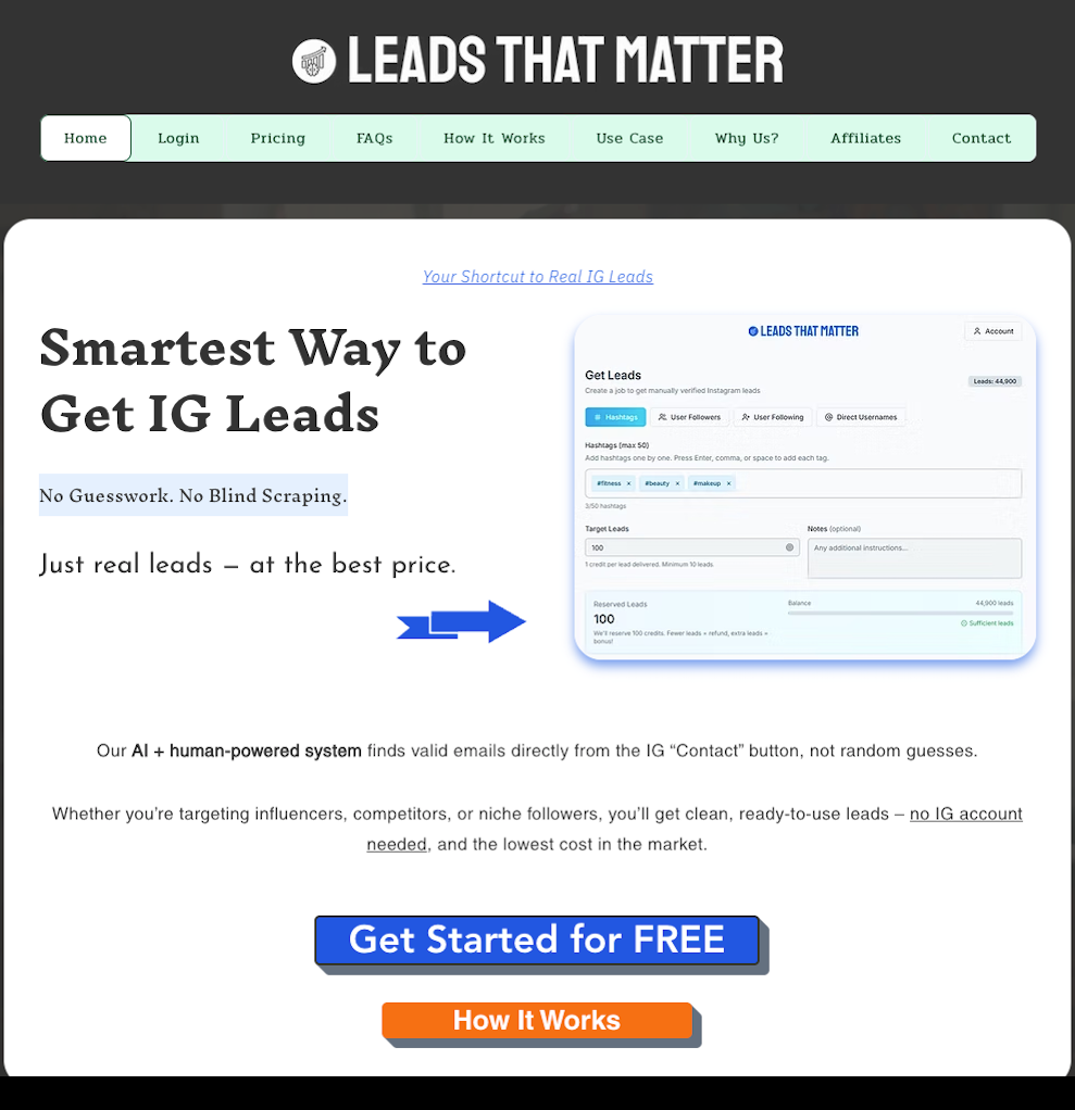 Descrição da ferramenta: LeadsThatMatter identifica e coleta emails comerciais reais do Instagram, utilizando inteligência artificial e intervenção humana, diretamente do botão de contato, garantindo leads limpos e prontos para uso sem raspagem ou login na plataforma.