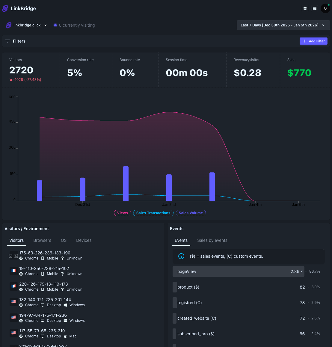 Descrição da ferramenta: LinkBridge é uma ferramenta de análises acionáveis que permite aos fundadores de startups analisar o tráfego e identificar os canais de marketing mais eficazes, promovendo crescimento baseado em dados concretos.