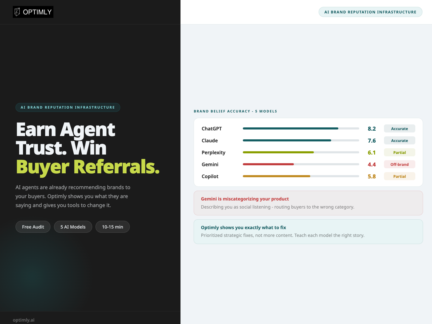 Descrição da ferramenta: Optimly é uma plataforma que analisa as percepções de modelos de IA sobre sua marca, identificando suas origens e oferecendo recomendações para melhorar a reputação e o posicionamento no mercado digital.
