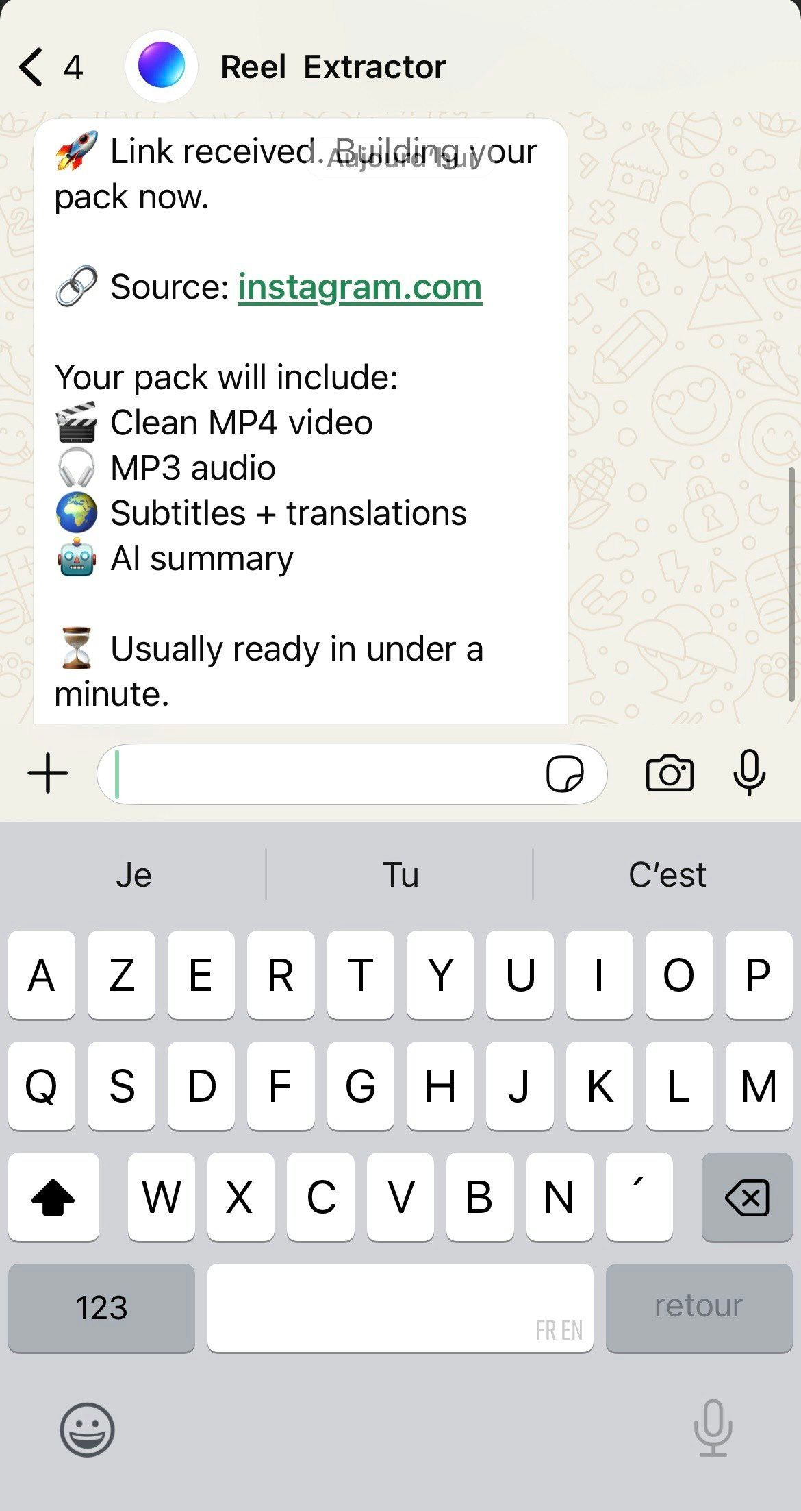 Descrição da ferramenta: ReelExtract é uma ferramenta automatizada via WhatsApp que permite baixar vídeos, extrair áudio, gerar legendas multilíngues e criar resumos com inteligência artificial a partir de links públicos de TikTok, Reels ou YouTube Shorts, tudo em menos de um minuto.