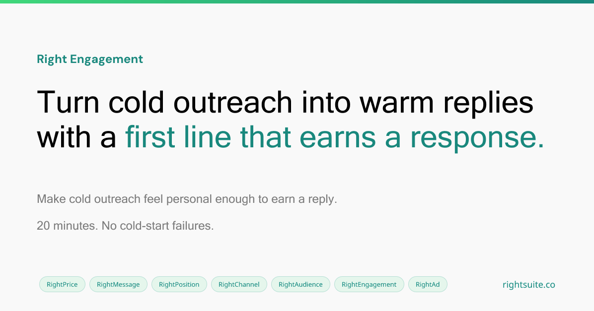 Descrição da ferramenta: Right Engagement é uma ferramenta que prevê as taxas de resposta de mensagens de outreach para personas de SaaS, ajudando a otimizar o conteúdo e os canais antes do envio, aumentando a eficiência das campanhas.