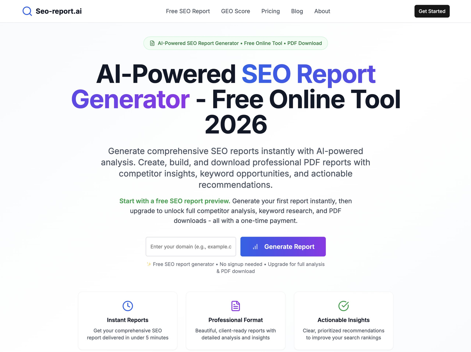Descrição da ferramenta: O SEO Report AI é uma ferramenta gratuita que gera relatórios detalhados de análise de SEO para qualquer site, oferecendo insights sobre aspectos técnicos, conteúdo, backlinks e Core Web Vitals, com recomendações acionáveis e exportação em PDF.