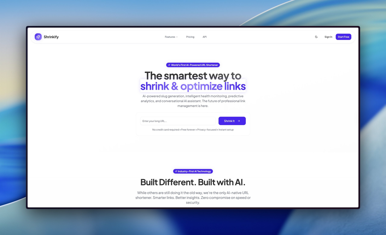 Descrição da ferramenta: Shrinkify é um encurtador de URLs com inteligência artificial que permite interagir, fazer perguntas e monitorar o desempenho dos links de forma acessível e econômica, oferecendo funcionalidades avançadas com facilidade de uso.