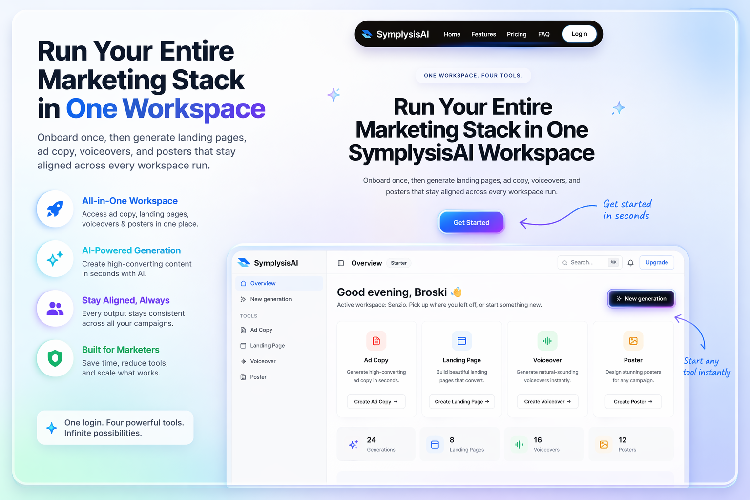 Descrição da ferramenta: SymplysisAI oferece uma solução integrada de campanha publicitária, incluindo criação de textos, landing pages, posters e voiceovers, além de gerenciamento de anúncios e interações em redes sociais com uma única assinatura.