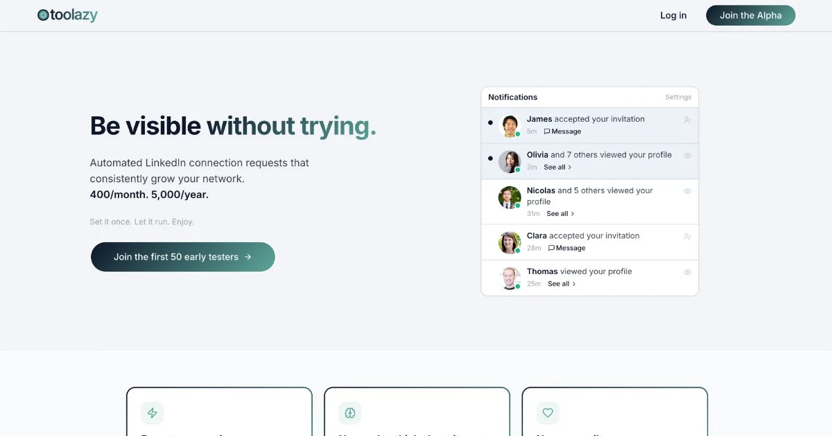 Descrição da ferramenta: Toolazy automatiza o envio de convites personalizados no LinkedIn, facilitando conexões estratégicas com contatos relevantes, seja para negócios, recrutamento ou parcerias, otimizando o processo de networking e iniciando conversas autênticas.