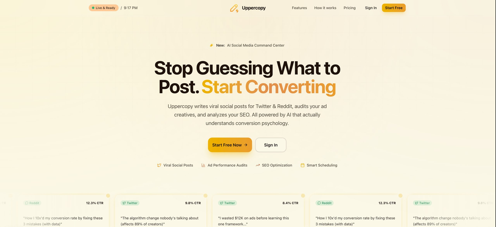 Descrição da ferramenta: Uppercopy é uma plataforma centralizada para criação, otimização e gerenciamento de conteúdo em múltiplas redes sociais, facilitando a produção rápida e eficiente de posts virais, auditoria de SEO e reaproveitamento de conteúdos.