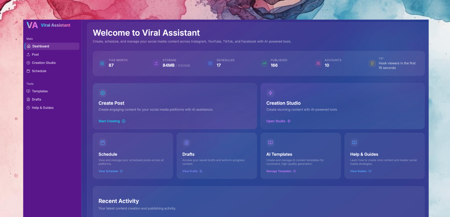 Descrição da ferramenta: Viral Assistant é uma plataforma de gerenciamento de redes sociais alimentada por inteligência artificial, que facilita a criação, agendamento e publicação de conteúdo em múltiplas plataformas simultaneamente, acelerando o alcance viral dos criadores.
