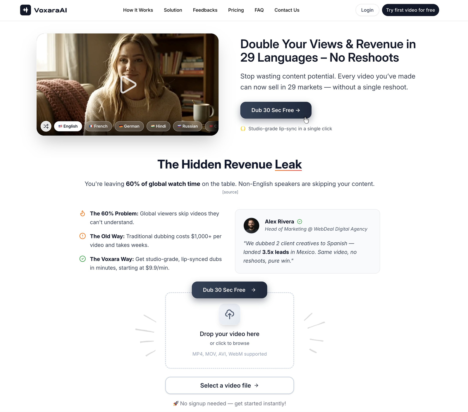 Descrição da ferramenta: VoxaraAI converte vídeos em conteúdo multilíngue com dublagem e sincronização labial realistas, eliminando a necessidade de estúdio ou atores. Permite ampliar o alcance de campanhas, criar conteúdos diversos e facilitar treinamentos em múltiplos mercados com facilidade.