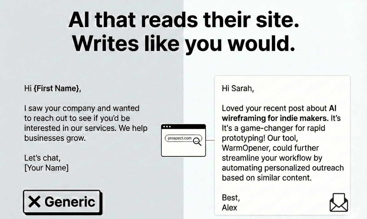 WarmOpener automatiza visitas a sites de prospects para entender seus negócios, gerando campos personalizados com IA e facilitando campanhas de email frio escaláveis e eficientes, sem custos adicionais por usuário ou marcações de créditos.