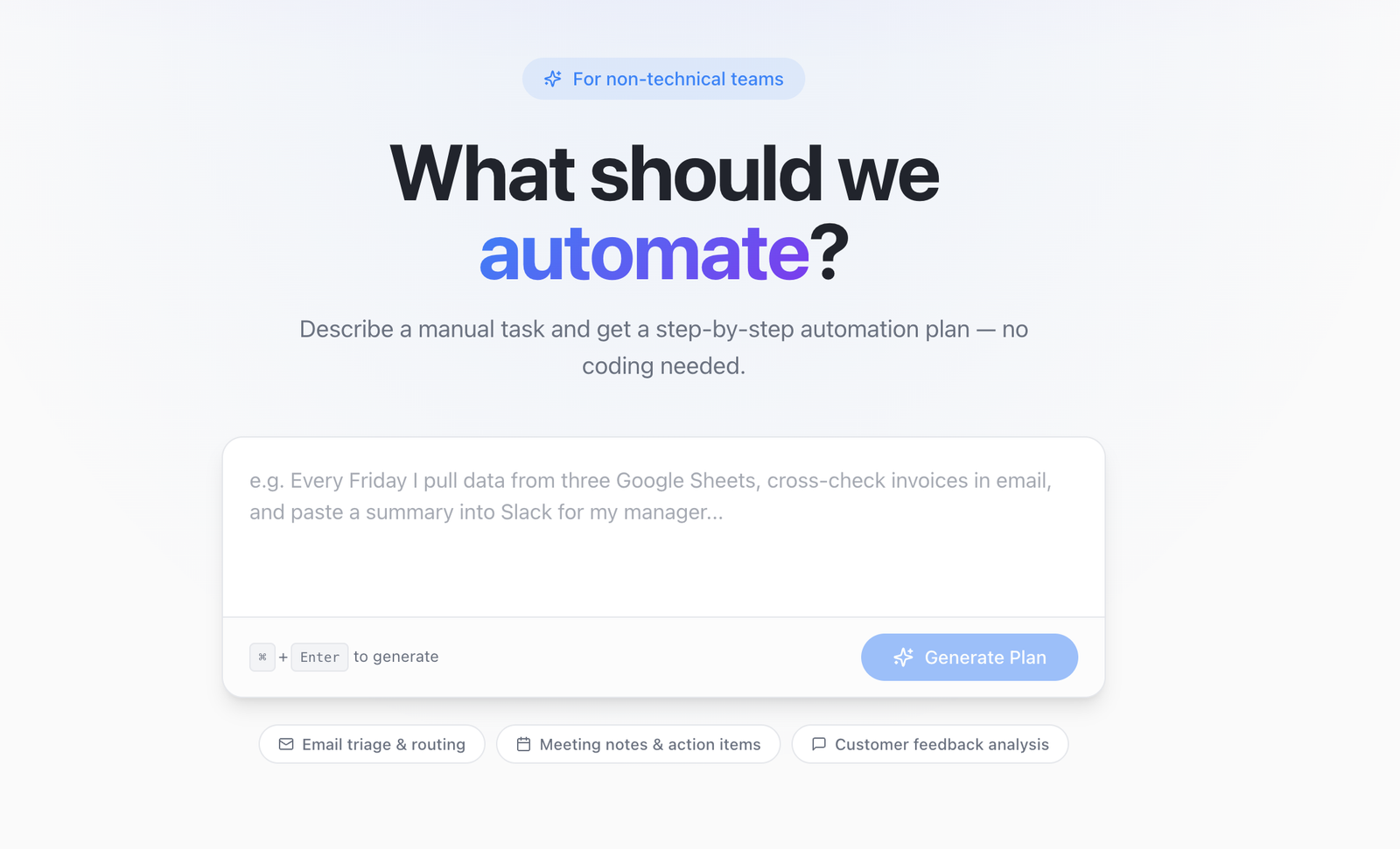 📋 Criar planos de automação: Transformar uma descrição de tarefa em um fluxo automatizado detalhado.