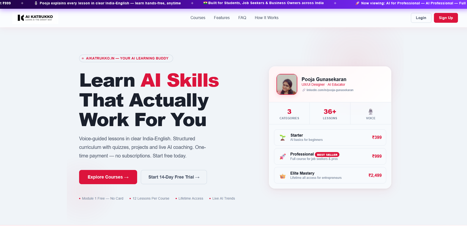 Descrição da ferramenta: AI Katrukko é uma plataforma de aprendizado de IA bilíngue, oferecendo cursos gratuitos sobre ChatGPT, Claude AI e Engenharia de Prompt para estudantes, profissionais e empresários, promovendo acessibilidade linguística e conhecimento técnico em Tamil e Inglês.