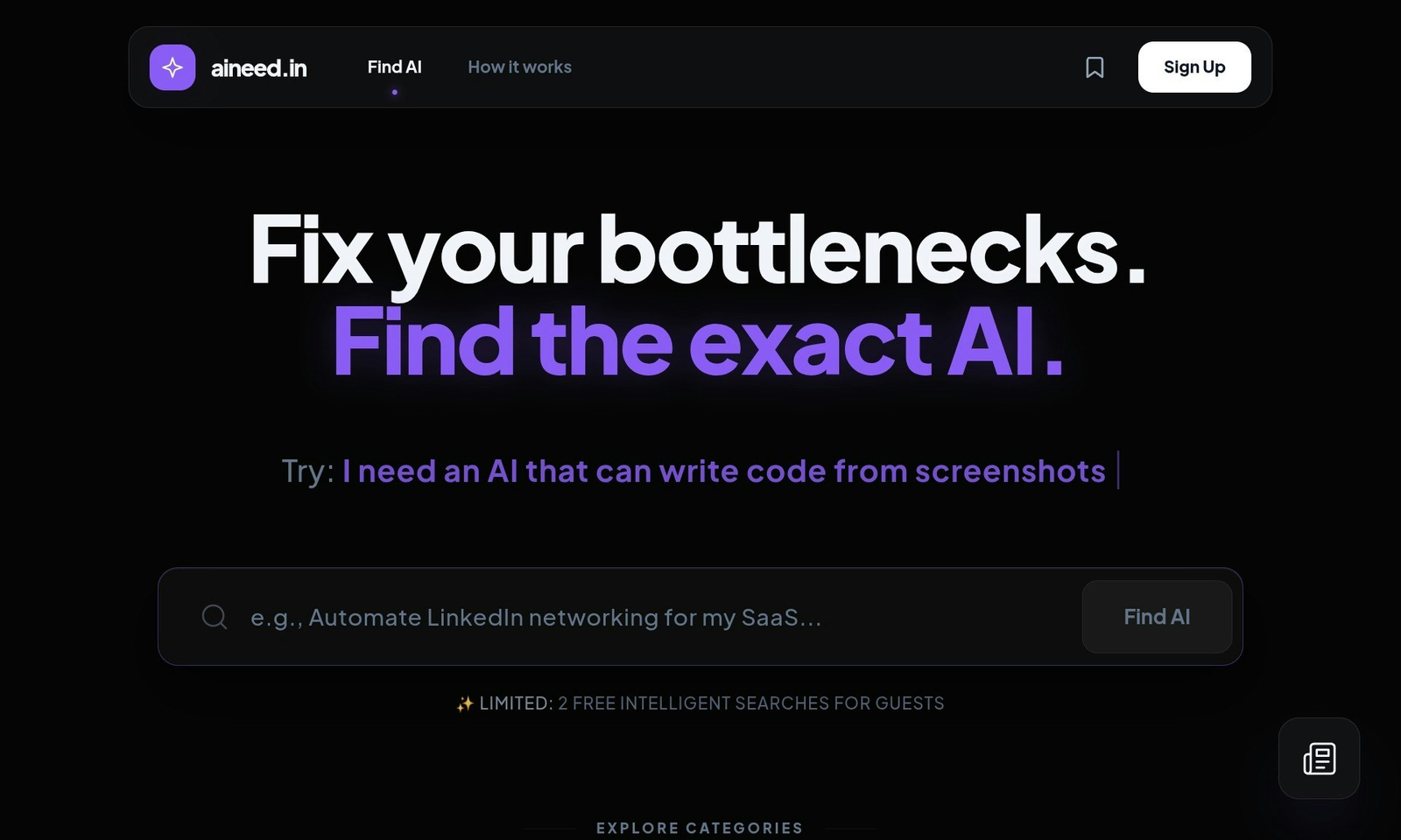 Aineed.in é uma plataforma que identifica gargalos em fluxos de trabalho e recomenda ferramentas de inteligência artificial específicas para otimizar processos, facilitando a integração rápida de IA em diferentes ambientes profissionais.