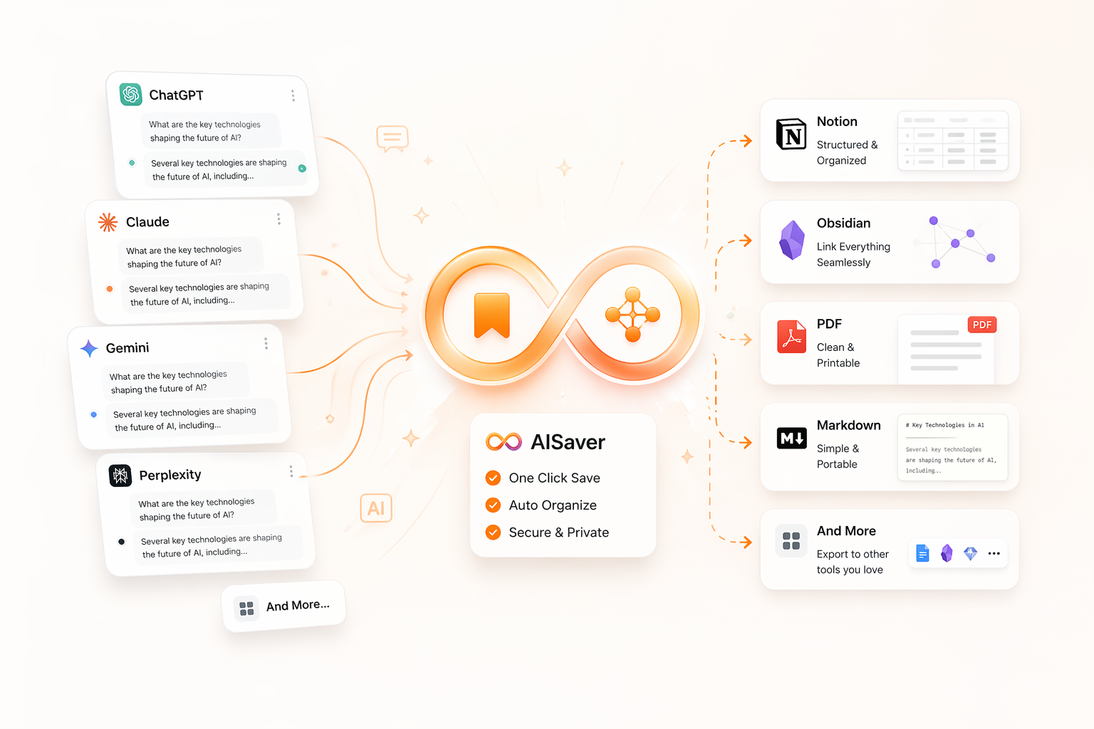 Descrição da ferramenta: AISaver é uma ferramenta que permite exportar em massa conversas de IA para diversos formatos, como Notion, Markdown, PDF e workflows compatíveis com Obsidian, facilitando a preservação e organização do conhecimento gerado.