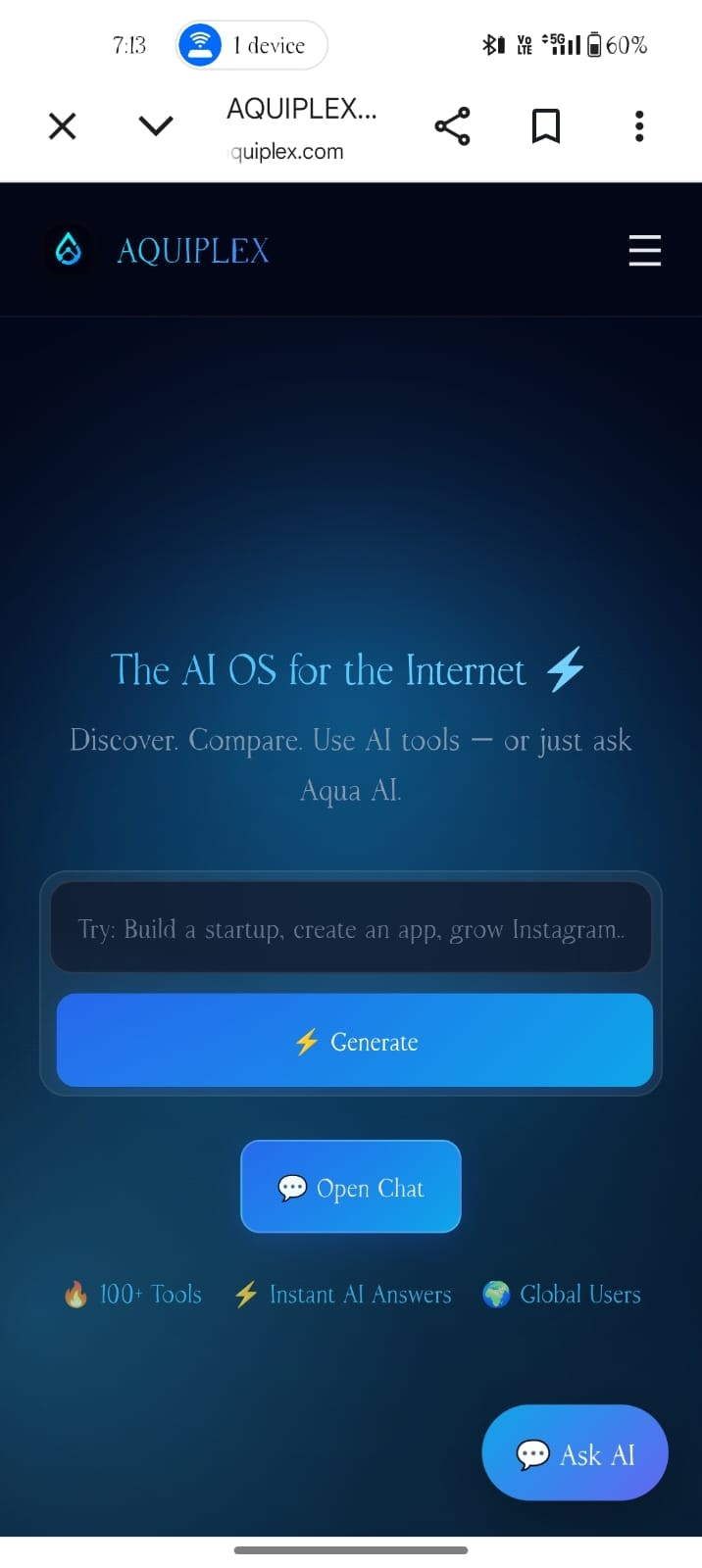 Descrição da ferramenta: Aquiplex é uma plataforma integrada de IA que combina múltiplas funcionalidades, permitindo gerar código, criar imagens e desenvolver projetos em um único ambiente, otimizando o fluxo de trabalho dos usuários.