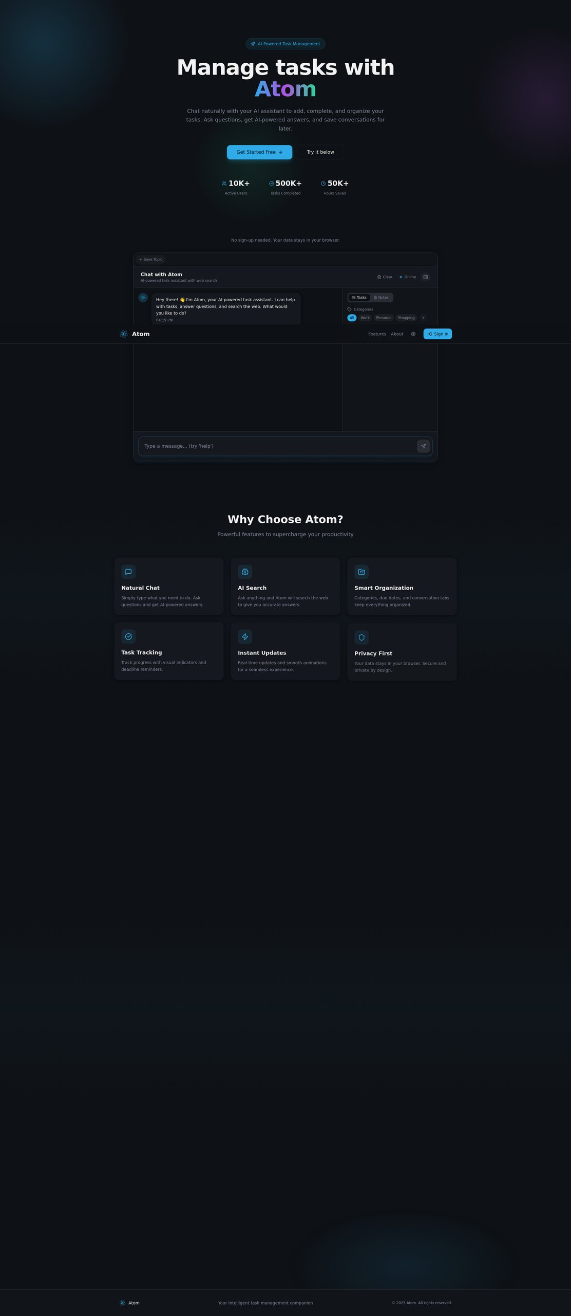 Descrição da ferramenta: O Atom é um gerenciador de tarefas com inteligência artificial que permite gerenciar atividades diárias, conversar de forma natural e obter respostas rápidas, promovendo organização eficiente e produtividade aprimorada.