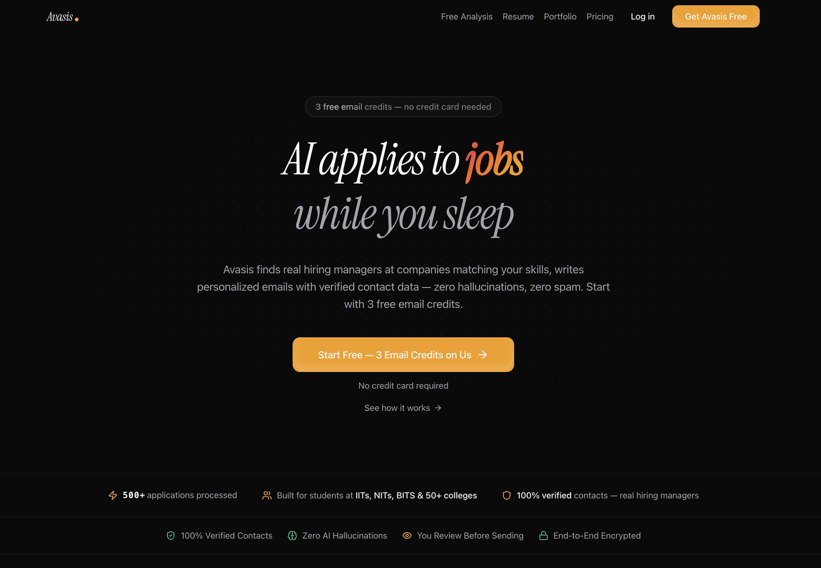Descrição da ferramenta: Avasis é uma plataforma de inteligência artificial que auxilia estudantes indianos a otimizar candidaturas, criando currículos ATS, identificando recrutadores verificados e enviando e monitorando e-mails personalizados para aumentar as chances de contratação.