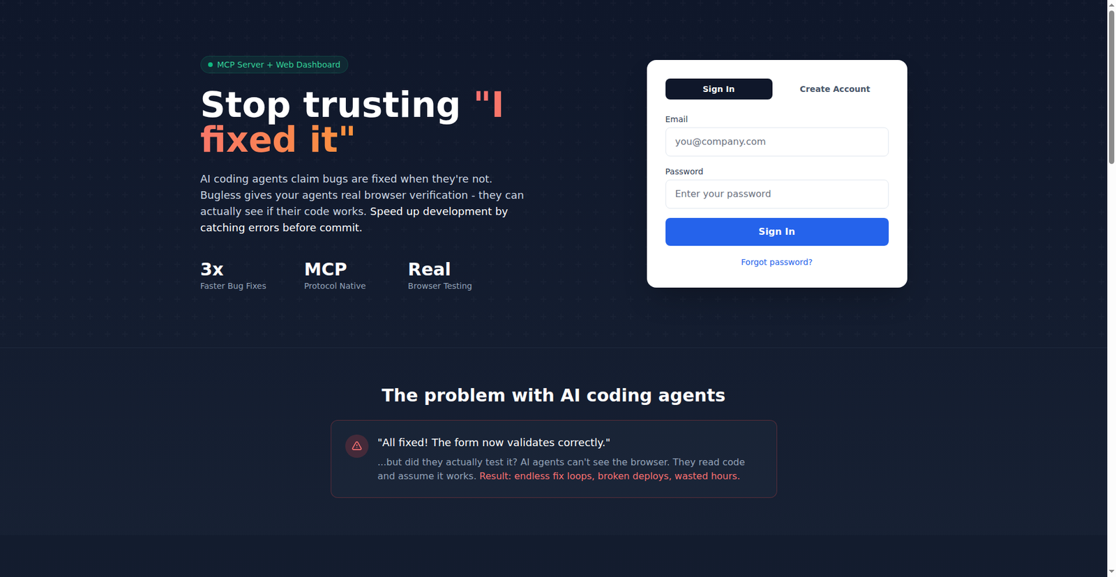 Bugless é uma plataforma de testes automatizados baseada em IA que avalia websites usando imagens, sem necessidade de scripts ou seletores, realizando testes autônomos e monitoramento em tempo real.