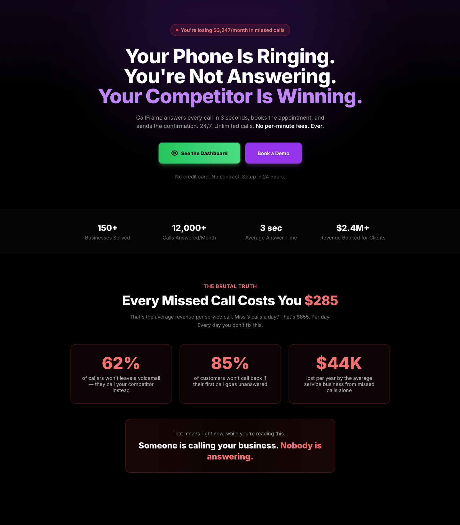 Descrição da ferramenta: CallFrame é uma recepcionista virtual 24/7 que atende chamadas, agenda compromissos automaticamente, envia confirmações por SMS e alerta os negócios instantaneamente, otimizando o atendimento em diversos setores como limpeza, HVAC, encanamento e telhados.