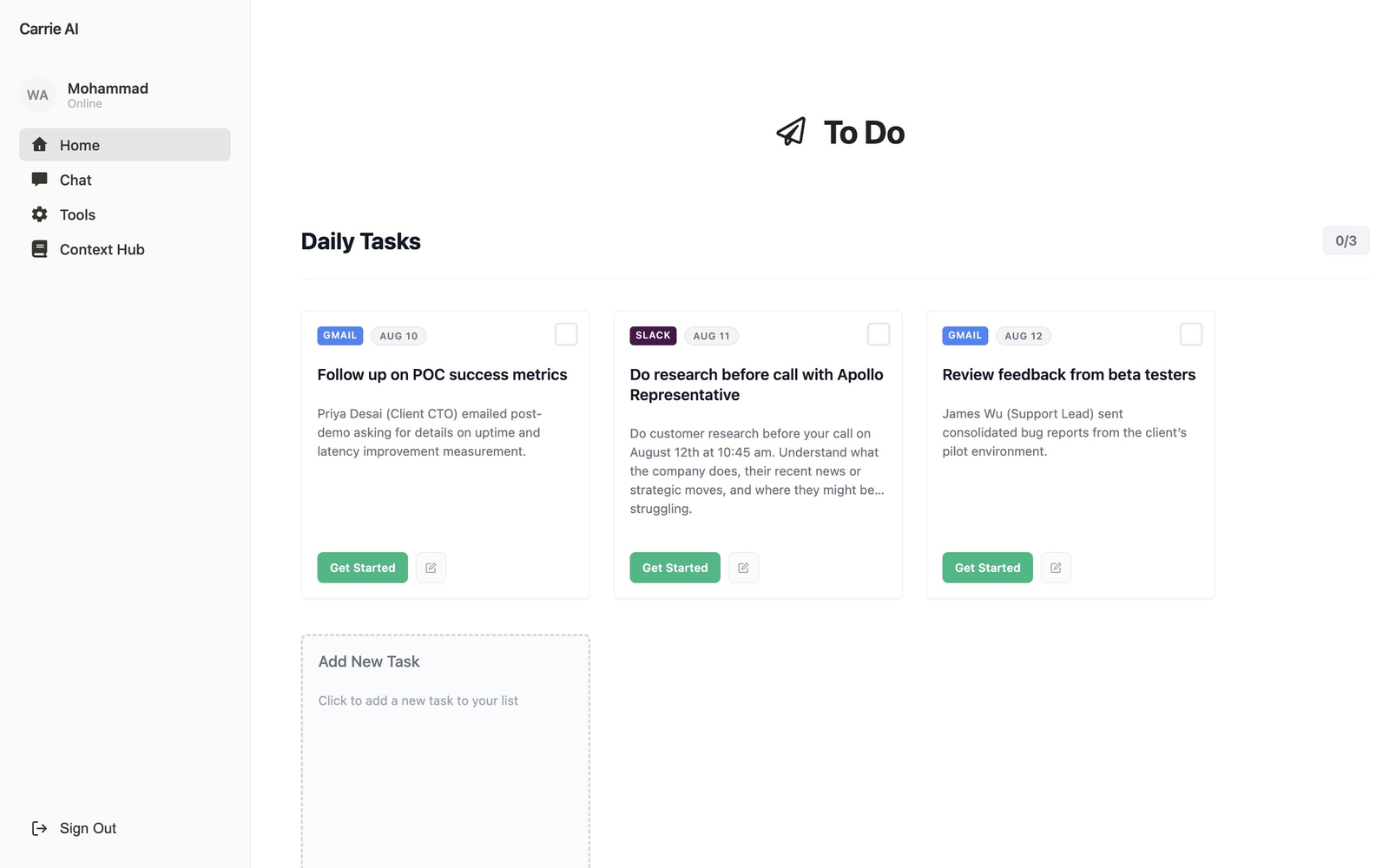Descrição da ferramenta: Carrie AI é uma inteligência artificial proativa que integra-se ao fluxo de trabalho, automatizando tarefas como envio de e-mails, pesquisa e análise de arquivos a partir de plataformas como Email, Slack e calendário, antes mesmo de serem solicitadas.