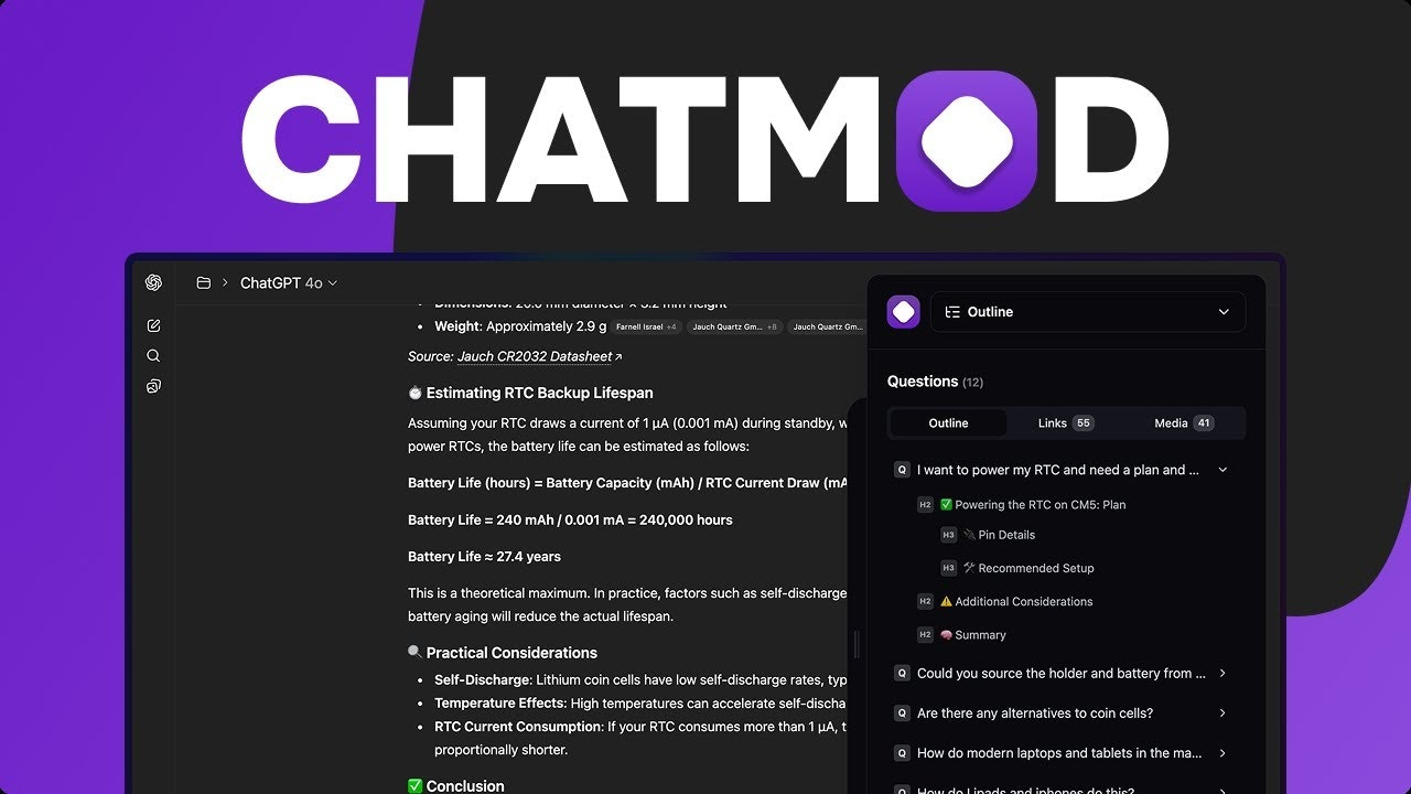 Descrição da ferramenta: ChatMod é uma extensão do Chrome que aprimora chatbots de IA, permitindo organizar conversas, acessar links e imagens facilmente, além de oferecer recursos avançados como salvamento, categorização e exportação de chats.