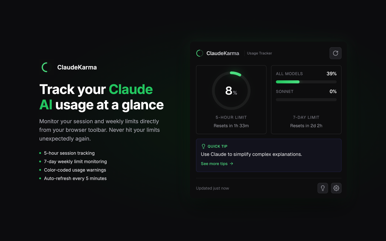 Descrição da ferramenta: ClaudeKarma é uma extensão de navegador que exibe o uso do Claude AI, incluindo limites de sessões e semanais, por meio de indicadores visuais dinâmicos e atualizações em tempo real, garantindo controle eficiente e privacidade dos dados.
