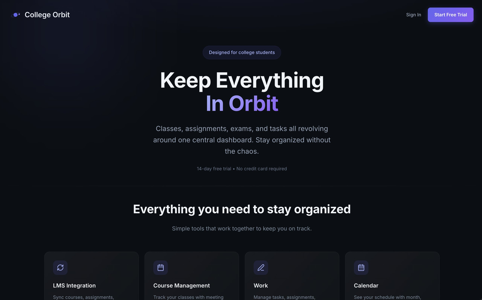 Descrição da ferramenta: College Orbit é uma plataforma que sincroniza automaticamente com o Canvas, integrando tarefas, prazos e notas dos estudantes universitários, facilitando o gerenciamento acadêmico sem necessidade de entrada manual de dados.