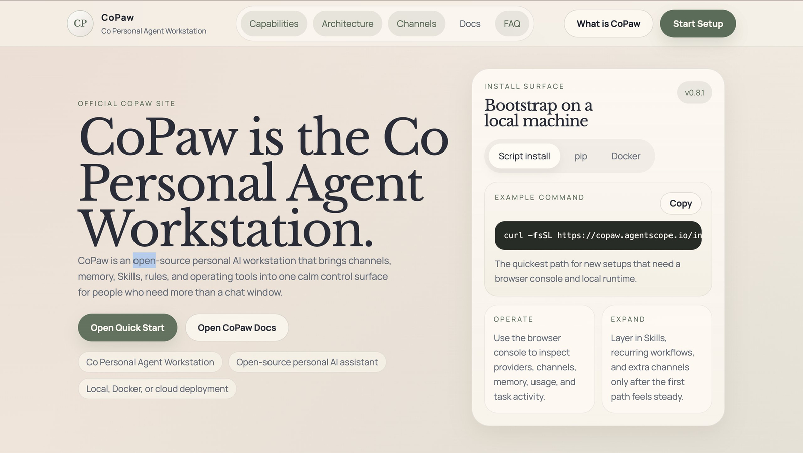 Descrição da ferramenta: CoPaw é uma estação de trabalho de IA pessoal de código aberto que integra canais, memória, habilidades e ferramentas operacionais em uma interface de controle unificada, facilitando automações e fluxos de trabalho recorrentes.