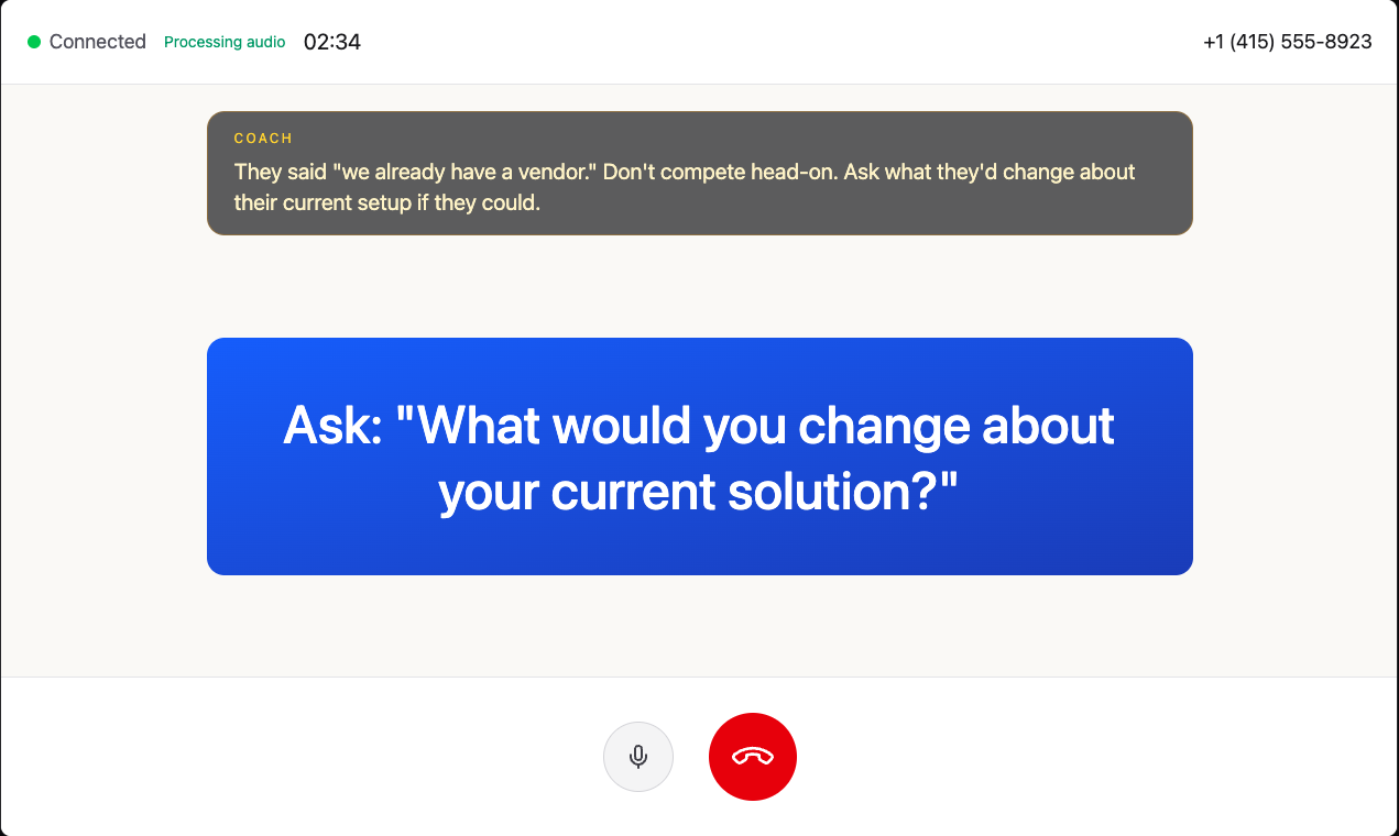 🗣️ Sugestões durante ligações ao vivo: Oferece respostas rápidas às objeções dos prospects.
