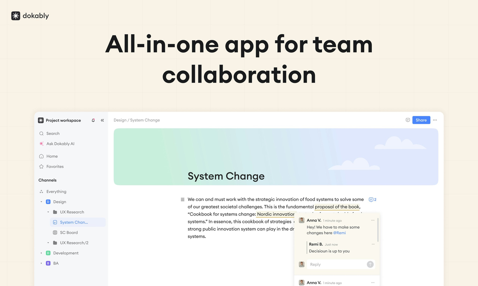Descrição da ferramenta: Dokably é uma plataforma integrada que combina documentos, quadros brancos, notas, tarefas e wikis em um espaço de trabalho inteligente, promovendo organização e conexão contínua dos dados da equipe sem troca constante de contexto.