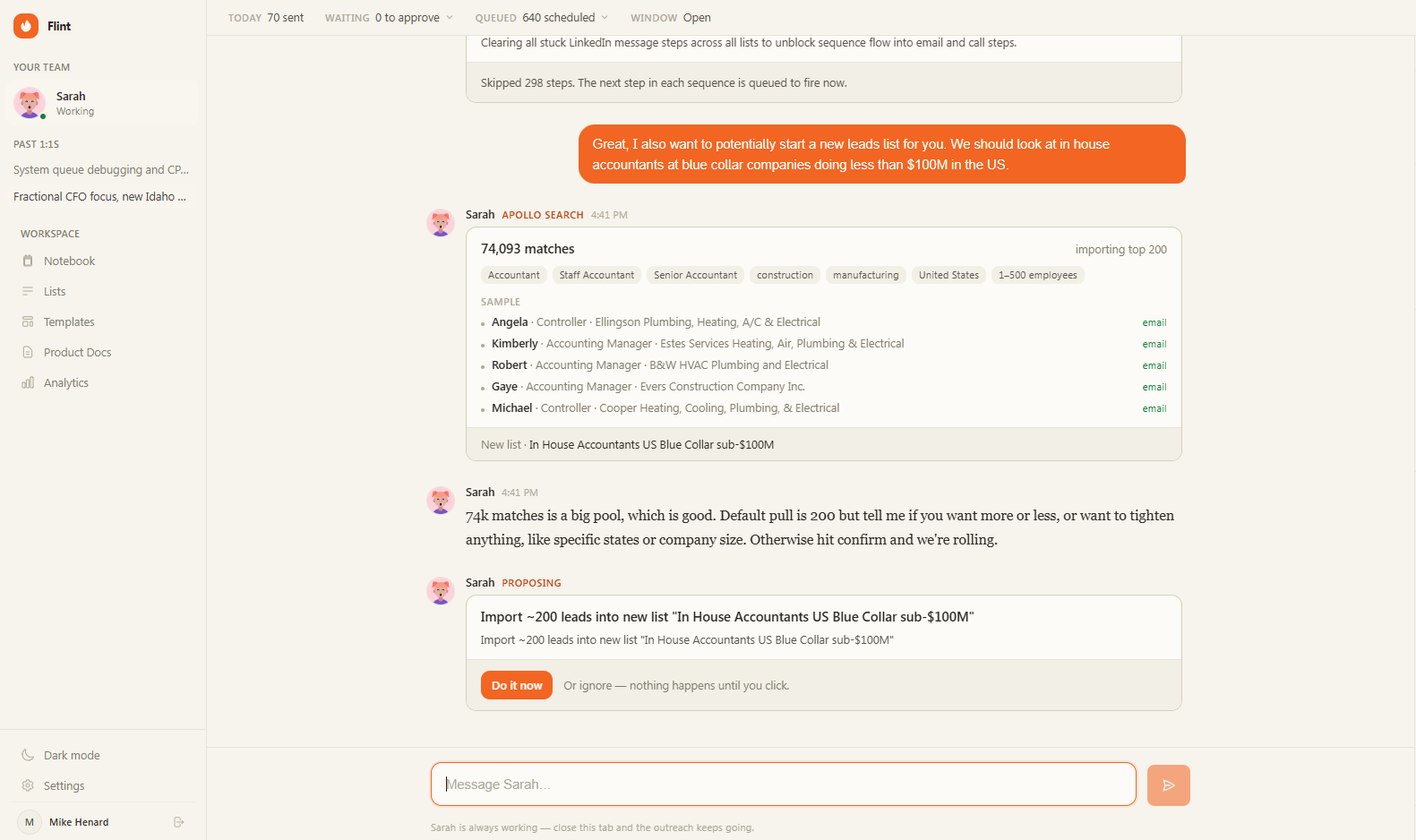 Descrição da ferramenta: Flint é uma inteligência artificial de SDR que realiza pesquisas, personaliza abordagens, gerencia respostas e agenda reuniões automaticamente, otimizando o processo de vendas com interações contínuas e aprendizado adaptativo.