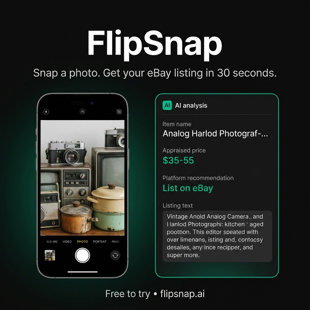 Descrição da ferramenta: FlipSnap é uma plataforma móvel que permite identificar itens, obter comparativos de vendas, calcular lucros e gerar anúncios prontos para plataformas como eBay, Facebook ou Garage Sale em poucos segundos, facilitando a revenda de produtos usados.