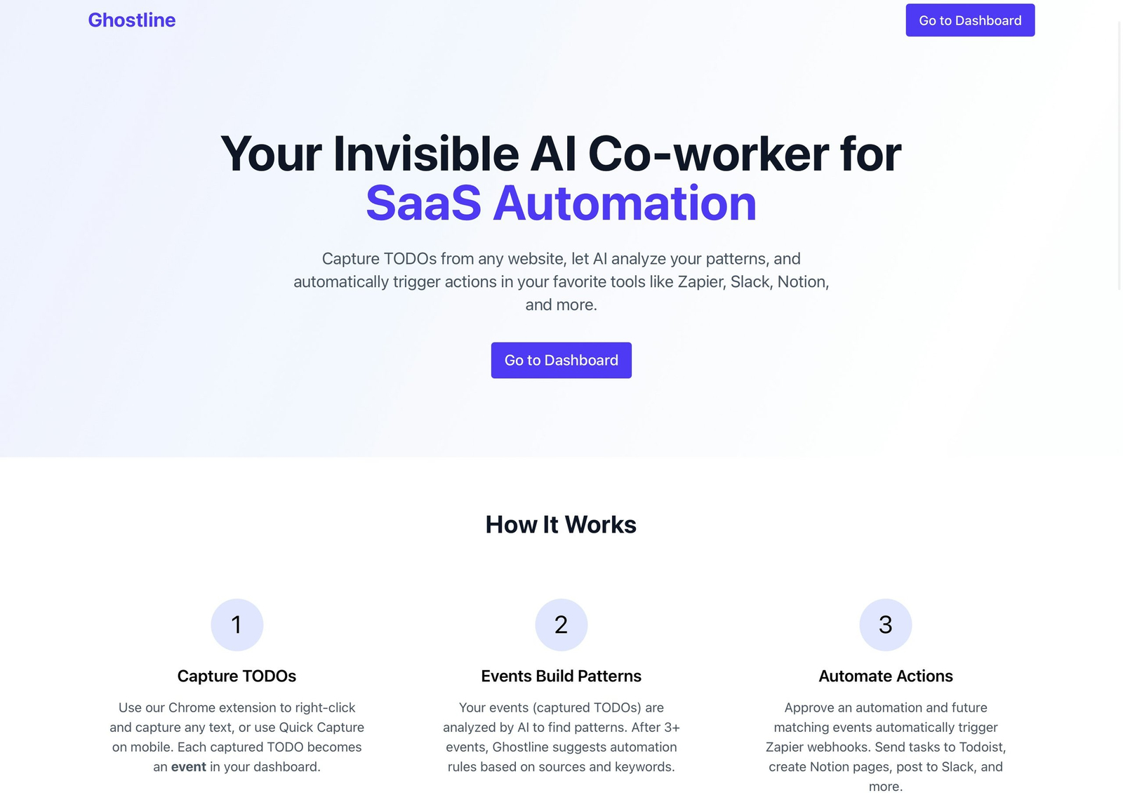 Descrição da ferramenta: Ghostline é uma camada invisível de IA que aprende seus hábitos de trabalho, automatizando tarefas repetitivas sem necessidade de configuração manual, otimizando o fluxo de trabalho com observação e automação aprovada pelo usuário.