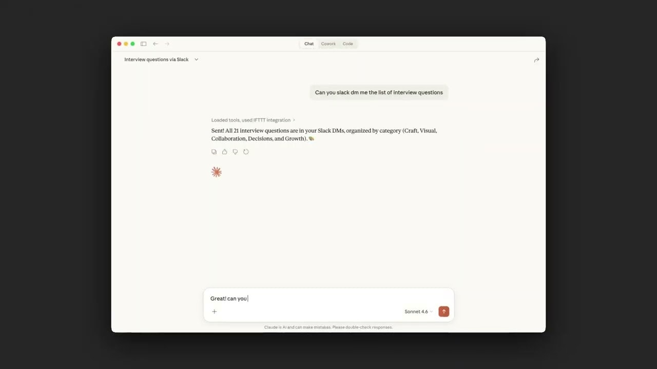 Descrição da ferramenta: O IFTTT MCP permite integrar o Claude a mais de 1000 aplicativos, possibilitando criar, acionar e acessar automações via inteligência artificial, facilitando tarefas como enviar mensagens no Slack ou controlar dispositivos inteligentes por meio de comandos de chat.