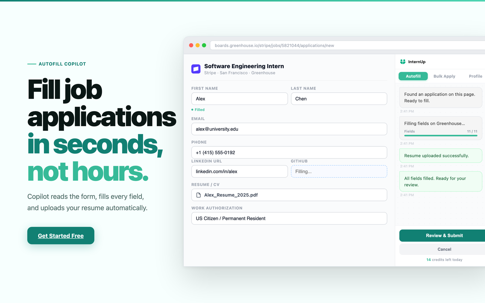 Descrição da ferramenta: Extensão para Chrome que automatiza partes repetitivas de candidaturas de emprego, gerencia uploads de currículos, aplica em massa e integra-se ao sistema InternUp para organização eficiente das aplicações.