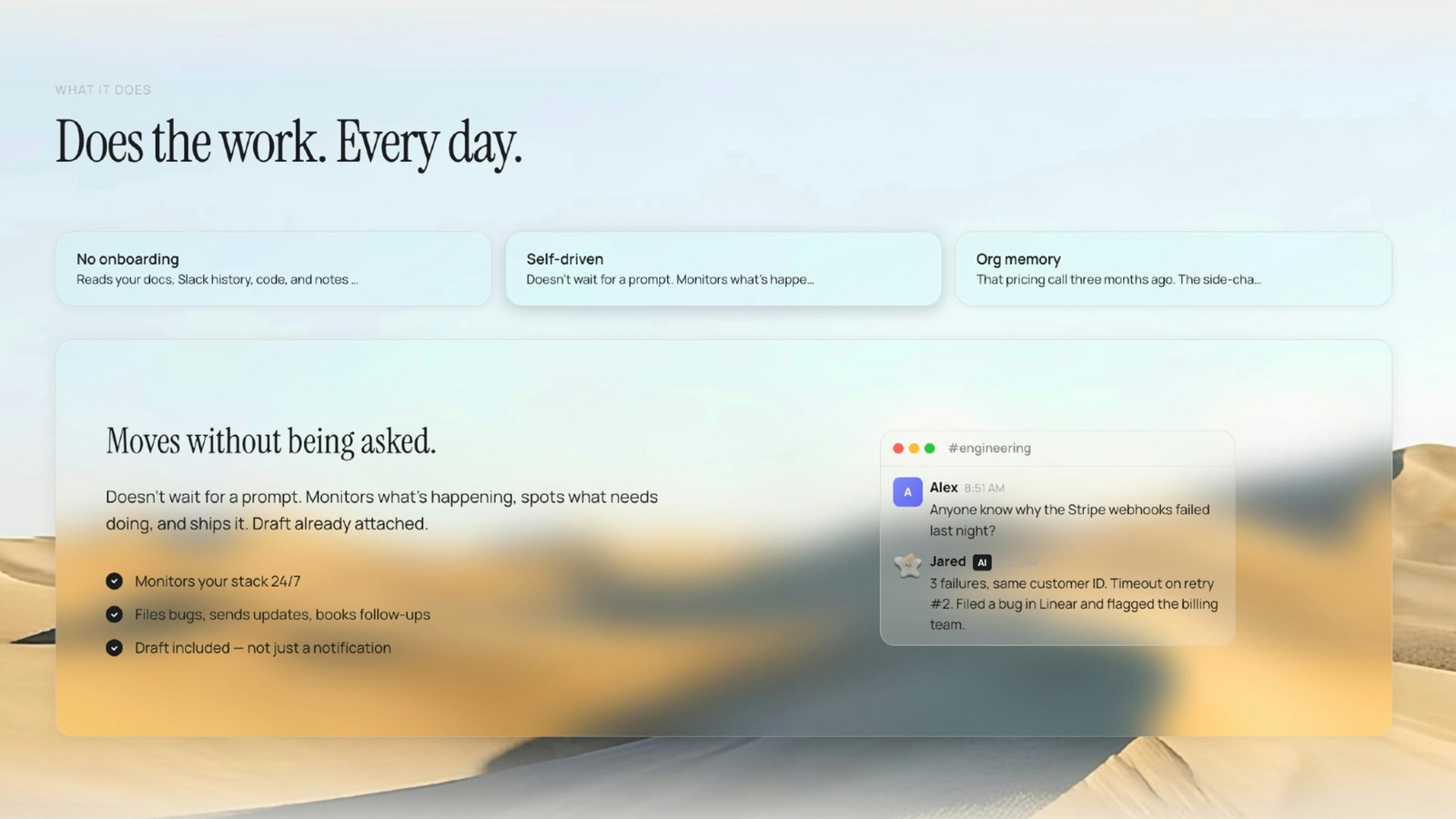 Descrição da ferramenta: Jared.so é uma inteligência artificial integrada ao Slack que conecta-se a mais de 10.000 ferramentas, realiza tarefas automaticamente e participa das conversas, atuando como um colaborador social que entende o contexto da equipe e interage quando necessário.