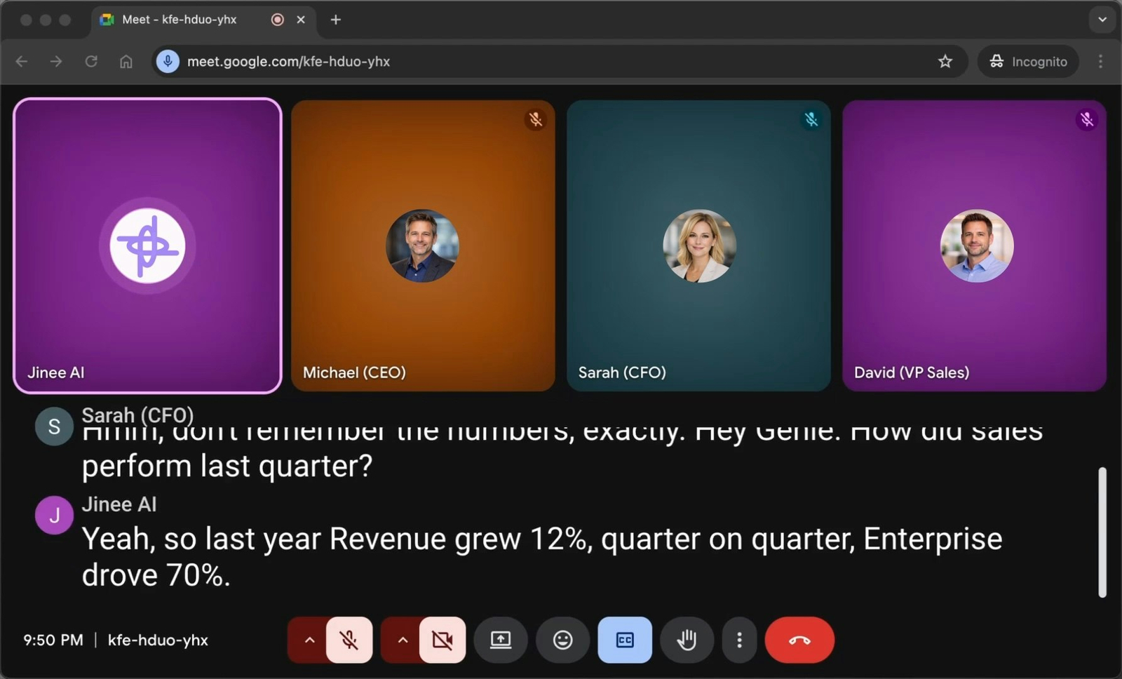 Descrição da ferramenta: Jinee AI é uma assistente de reuniões que acessa dados em tempo real de sistemas como Slack, Databricks e dashboards, respondendo perguntas durante a chamada de forma instantânea e interativa.