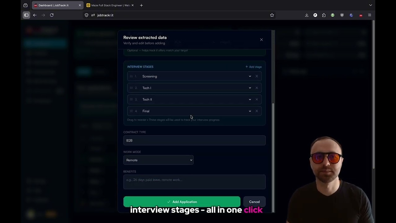 Descrição da ferramenta: JobTrackr.it é uma plataforma que permite acompanhar candidaturas de emprego a partir de URLs, automatizando a extração de informações e o monitoramento do progresso das aplicações com recursos de análise e coaching.