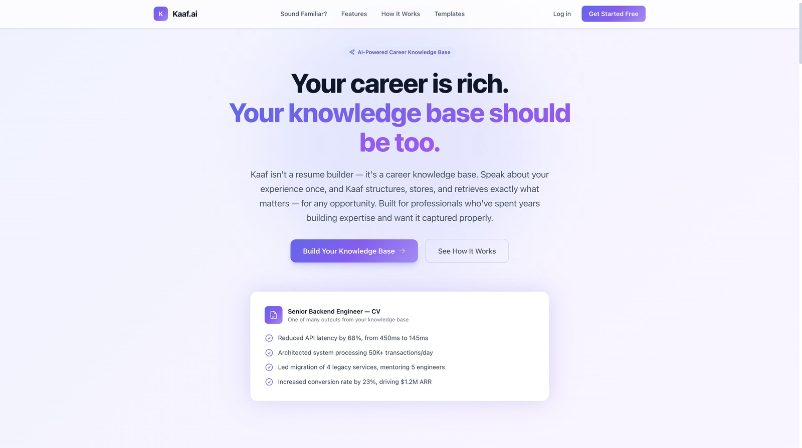 Descrição da ferramenta: Kaaf — Career Knowledge Base é uma plataforma que organiza e armazena informações profissionais, permitindo que usuários compartilhem suas experiências de forma estruturada e acessível para diversas oportunidades de carreira.