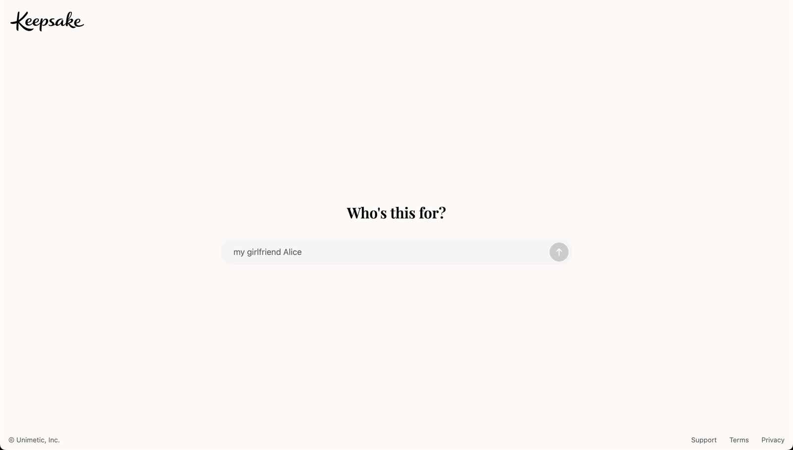 Descrição da ferramenta: Keepsake é uma plataforma que transforma mensagens pessoais em vídeos narrados e cinematográficos, proporcionando presentes emocionais e significativos de forma rápida e fácil, ideal para momentos especiais além de cartões tradicionais.